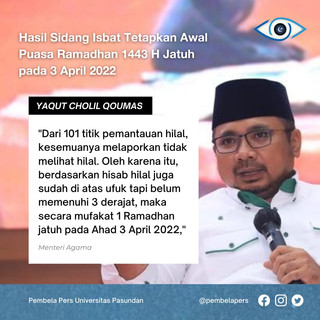 PEMBELA PERS - 2 April 2022 Pemerintah menetapkan bahwa 1 Ramadhan 1443 Hijriah jatuh pada Minggu, 3 April 2022. berdasarkan hasil pemantauan di 101 lokasi titik rukyatul hilal di seluruh Indonesia. Dari hasil pantauan, hilal belum terlihat 101 lokasi tersebut pada hari ini.